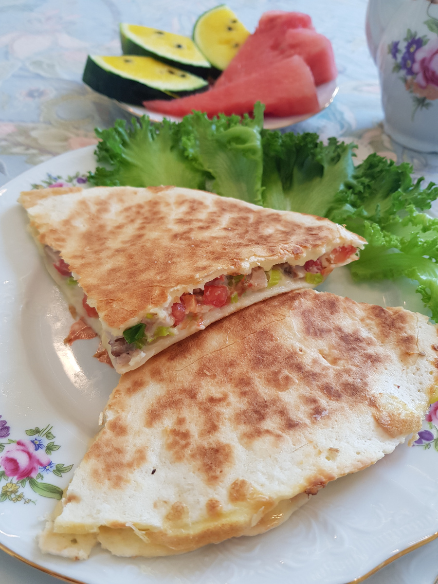 Когда тортилья готова, снимите её со сковороды и разрежьте на 4 части. Подавайте с листьями свежего салата, кусочками арбуза и чашечкой кофе. Приятного аппетита!