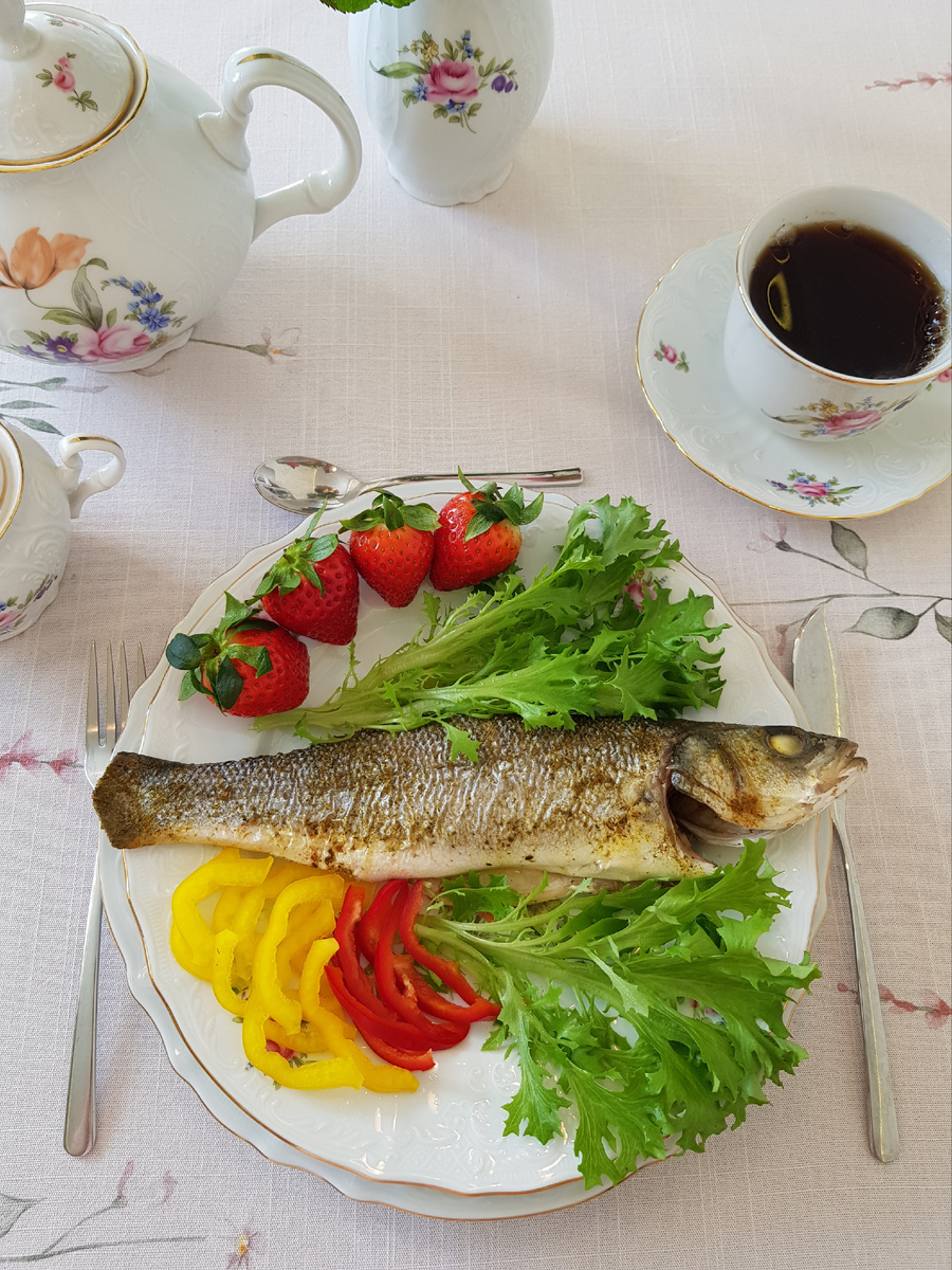 Когда сибас готов, раскладывайте его по тарелкам и подавайте с зеленью, сладким перцем и свежей клубникой. Наслаждайтесь вашим кулинарным шедевром!