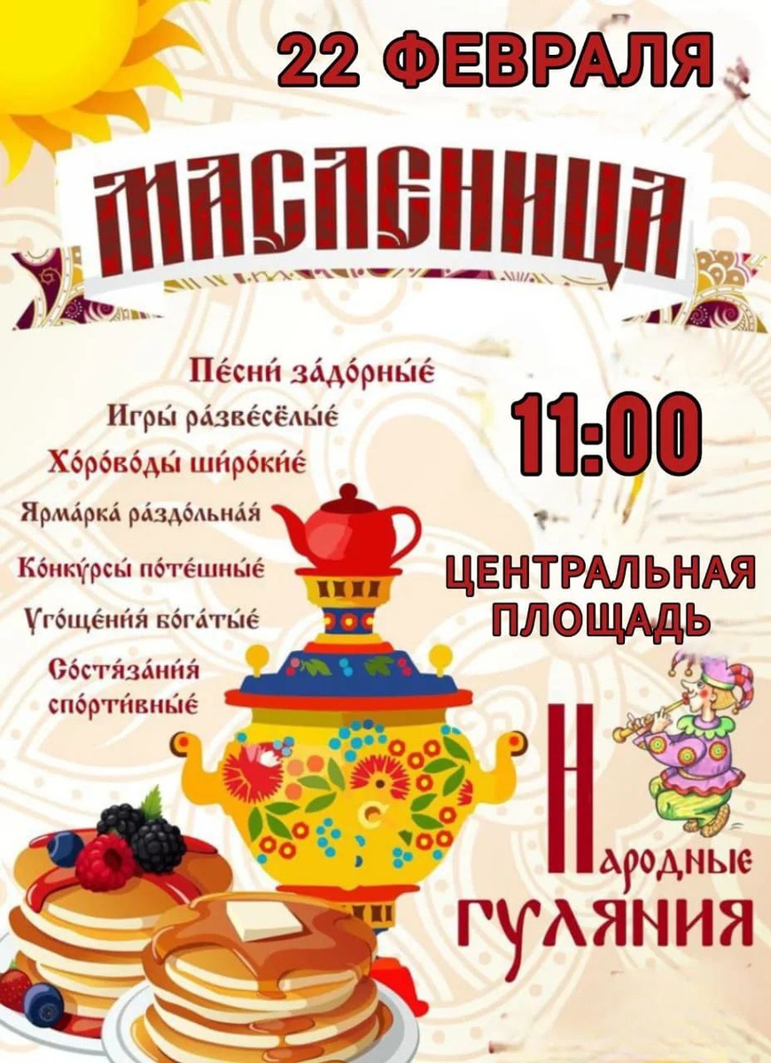 22 февраля в 11:00 на Центральной площади развернётся масштабный праздник, посвящённый любимой многими Масленице!