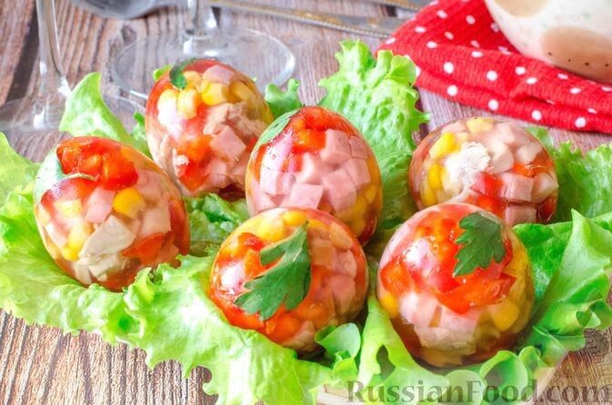 Не забудьте и о холодной закуске «Яйца Фаберже». Это блюдо удивит гостей своей изысканностью и необычной подачей в яичной скорлупе. Основные ингредиенты: куриные голени, ветчина и болгарский перец, а также легкое желе для завершения.
