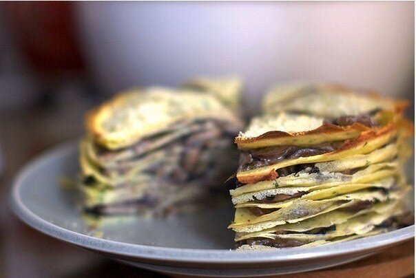 В блендере объединить яйца, 3/4 стакана молока, воду, муку, 3 столовые ложки масла и соль. Также можно добавить немного зеленого лука в тесто для аромата. Тщательно перемешайте и выпекайте тонкие блины на сковороде. Дайте им остыть.На крупной сковороде растопить оставшееся сливочное масло (1 столовая ложка) и готовить нарезанный лук, пока он не станет прозрачным, избегая поджаривания.Уменьшить огонь и добавить грибы с 2 столовыми ложками масла. Посолить, поперчить и тушить до мягкости грибов.Добавить 1 чайную ложку муки и, помешивая, влить 110 мл молока. Дать жидкости немного выпариться или уберите половину жидкости с сковороды. Вмешать тертый сыр до его полнейшего расплавления.Соберите торт, укладывая блины и начинку попеременно, оставляя последний блин для посыпки тертым сыром.Дайте торту немного настояться, затем нарежьте на 6-8 порций.