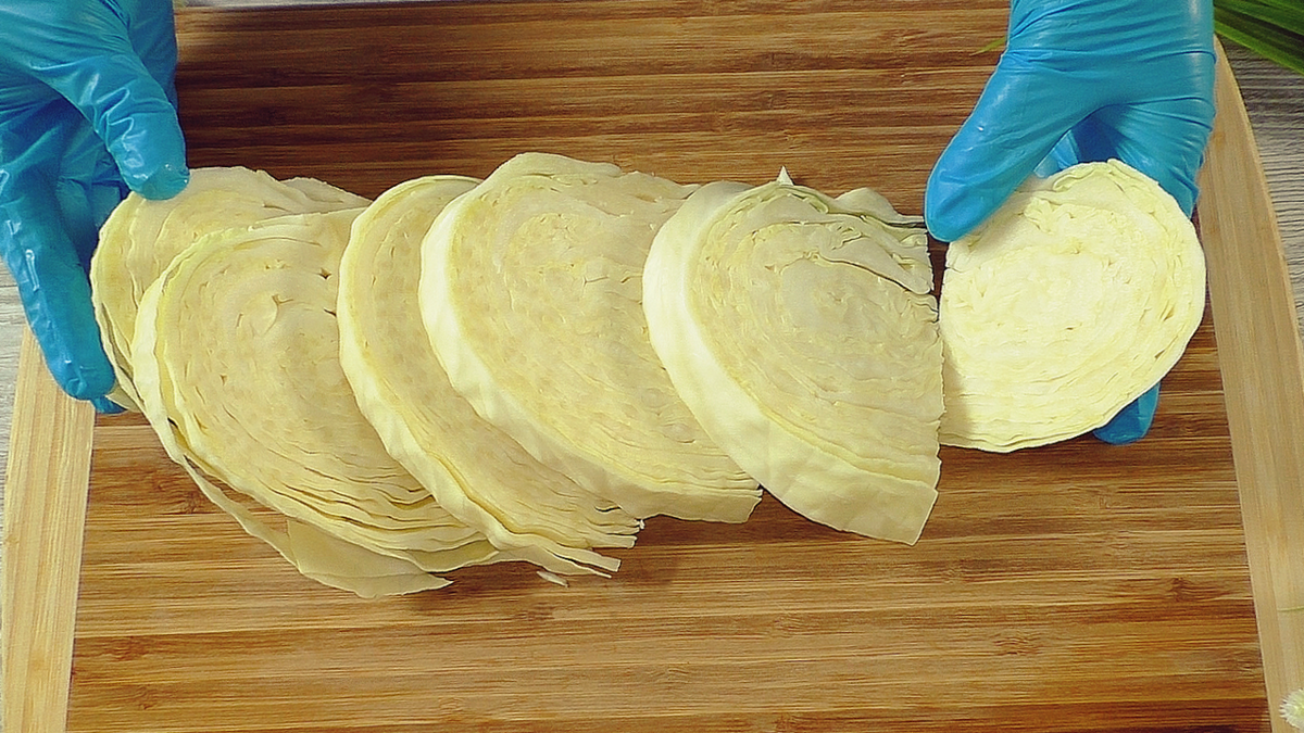 Капусту необходимо разрезать по кочерыжке на куски толщиной 1.5-2 см. Кочерыжка не удаляется, так как она помогает удерживать листья. Если капуста была не целиком, это не повлияет на конечный результат.