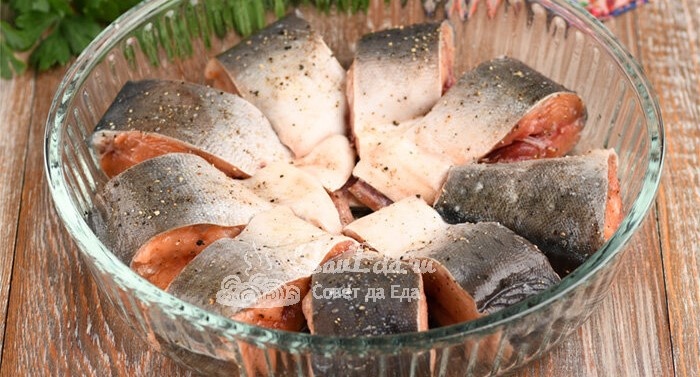 Для этого блюда понадобятся две небольшие горбушки общей массой около 1,7 кг. Рыбу нужно разморозить, очистить и нарезать на средние кусочки. Каждый кусок аккуратно приправляется молотым перцем и солью. Затем они располагаются в круглой форме, смазанной растительным маслом, образуя интересный цветочный узор.