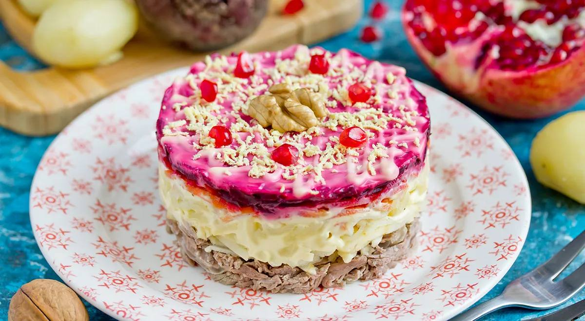 - Слоеный салат с говядиной и грецкими орехами — для тех, кто ценит традиционные вкусы.