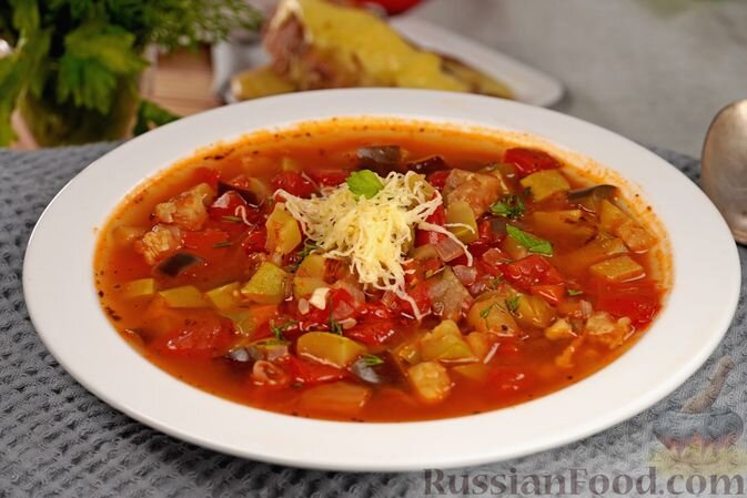 Суп с овощами и беконом. Легкий и питательный суп, в котором обжаривается бекон с овощами, такими как тыква, сладкий перец и кабачки. Подается с тертым сыром, что добавляет блюду неповторимый шарм.