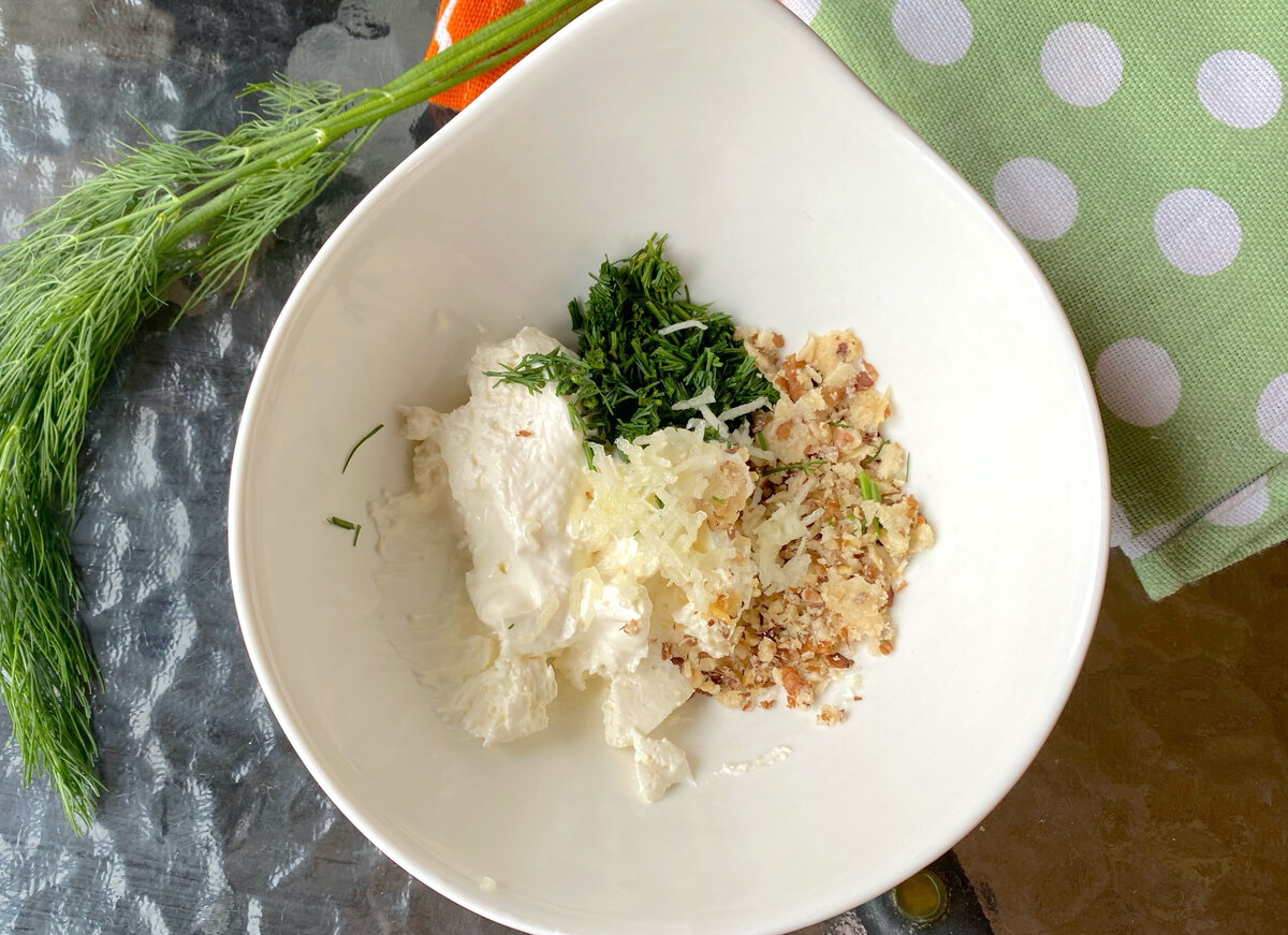 - В глубокой миске смешать творожный сыр, тертый чеснок, рубленый укроп и измельченные грецкие орехи. Не забудьте немного посолить и поперчить смесь.