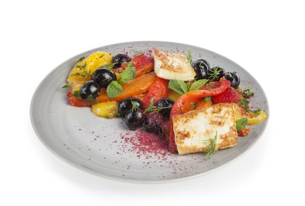 Подготовьте перцы: полейте их оливковым маслом, щедро посолите и поместите в духовку, разогретую до 180 градусов, на 10-15 минут, чтобы они запеклись.Пока овощи находятся в духовке, займитесь зеленью. Оборвите листья петрушки и укропа, мелко нарежьте, а мяту порубите чуть крупнее.Как только перцы готовы, аккуратно снимите с них кожуру, удалите семена, нарежьте их крупными полосками.Сыр халуми нарежьте на большие кубики и обжарьте на сковороде до золотистой корочки, можно использовать немного масла или обойтись и без него.Смешайте нарезанные перцы со свежей зеленью и щепоткой сумаха, выложите на красивое блюдо, а сверху посыпьте обжаренным сыром.Этот салат станет отличным дополнением к любому столу, а его яркие цвета поднимут настроение. Поделитесь рецептом с друзьями в социальных сетях и готовьте вместе с «Едой»!