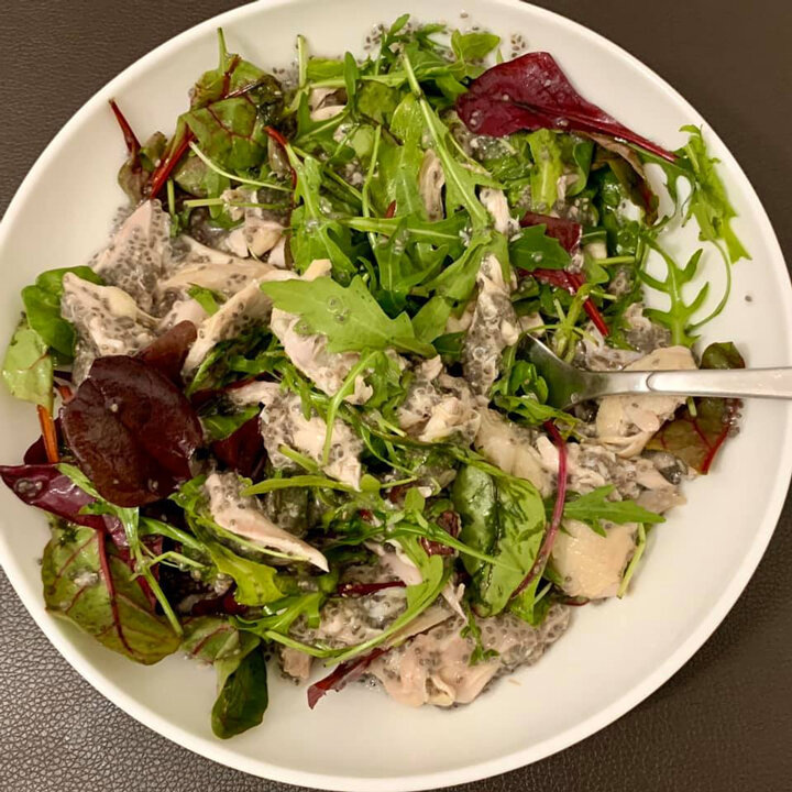 В глубокой посуде выложите свежие листья, мясо перепёлок и полейте сверху желеобразными семенами. Тщательно перемешайте все ингредиенты. Калорийность на 100 г салата составляет 131 калорию, с содержанием белков — 14,6 г, жиров — 4,8 г и углеводов — 7,6 г (2,5 г клетчатки и 5,1 г усваиваемых углеводов).