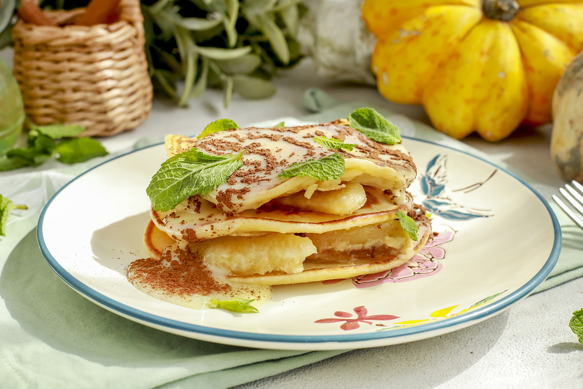 Шаг 5: Готовые оладьи выкладывать на тарелку, меж ними разместить банановую начинку, полить шоколадным соусом и посыпать какао. Для свежести можно украсить блюдо листочками мяты. Угощение готово к подаче!