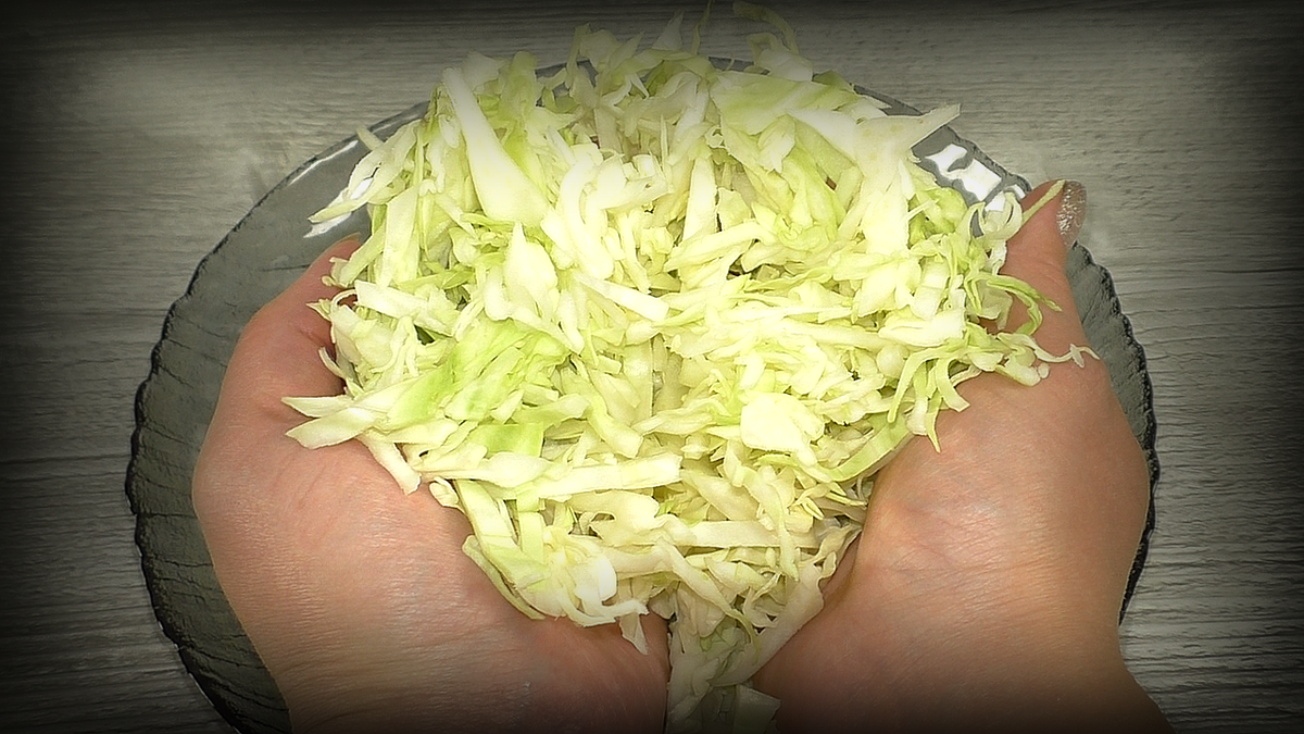 Первым делом капусту следует нарезать тонкой соломкой и немного посолить. Затем, чтобы капуста стала мягче и дала сок, её нужно тщательно перетирать руками. Желательно использовать свежую капусту!