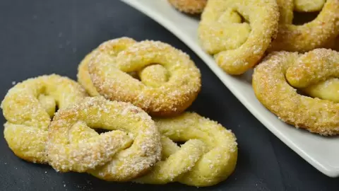 По окончании смешивания, следует объединить творожную массу с мукой и взяться руками за замес теста. После этого раскатать его в широкий пласт и формировать небольшие крендельки. Для этого достаточно создать тонкий валик из теста и свернуть его в виде кренделека. Не забудьте посыпать каждое печенье сахаром!