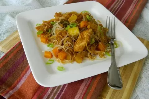 Фунчозу следует готовить в соответствии с инструкцией на упаковке: можно отварить или просто залить горячей водой. Морковь нарезать кубиками, зеленый лук – колечками, грудку индейки – соломкой, а ананас – небольшими кубиками.