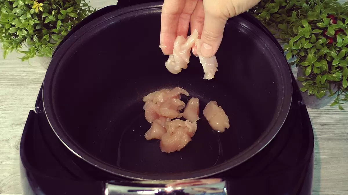 Начинается все с обжаривания куриного мяса в мультиварке или на плите с небольшим количеством подсолнечного масла. Мясо обжаривается до изменения цвета в течение 3-4 минут. Затем к мясу добавляются мелко нарезанные лук и морковь, обжарка продолжается еще пару минут, после чего режим «жарка» отключается.