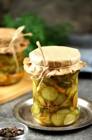 Как только огурцы приобретают оливковый цвет, салат готов. Его разливают по стерилизованным банкам и закрывают прокипячёнными крышками. Укутать банки следует для более качественной консервации.