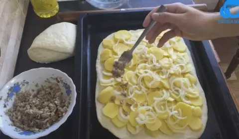 Теперь пришло время формировать пирог. Тесто разделить на две части, одну сделав немного больше. Раскатать обе части до толщины около 5 мм. Первую пласт положить на противень, выложить на него картофель и лук. Посолить и поперчить по вкусу, затем распределить сайру. Накрыть вторым пластом теста и осторожно скрепить края.