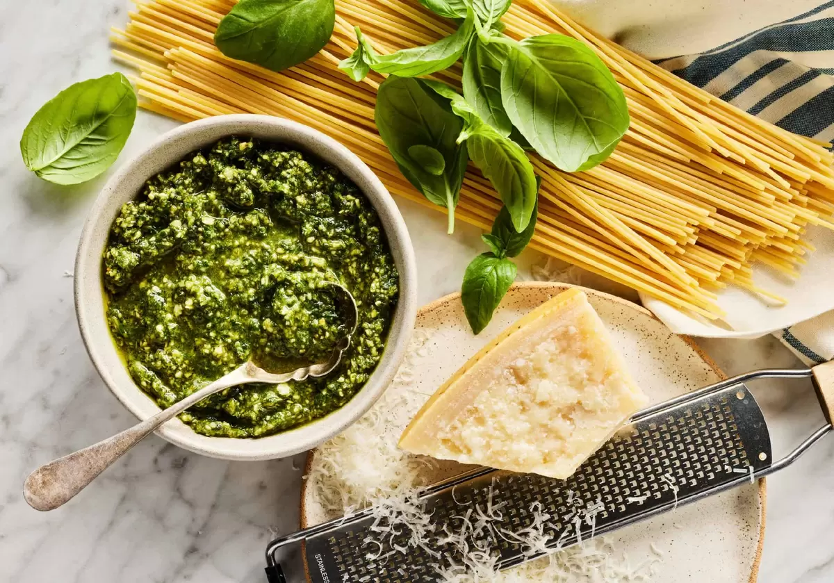 Традиционный генуэзский песто (Pesto alla Genovese) представляет собой нечто большее, чем просто смесь ингредиентов. Его основные составляющие: