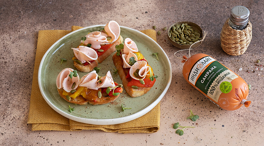 3. Ломтики чиабатты подрумяньте на сковороде с обеих сторон, затем переложите их на сервировочную тарелку. На каждый кусочек уложите запеченный перец, сбрызните чесночно-масляной смесью. Завершите оформление, добавив ломтики ветчины и щедро посыпав тыквенными семечками. Эти закуски лучше всего подавать сразу же после подготовки.