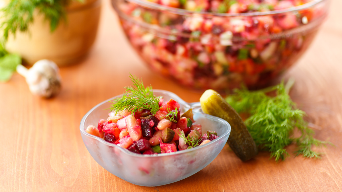Этот винегрет способен покорить даже самых привередливых гурманов. Новое дыхание традиционного блюда придают добавление зеленого горошка и фасоли, что делает его особенно аппетитным и насыщенным.