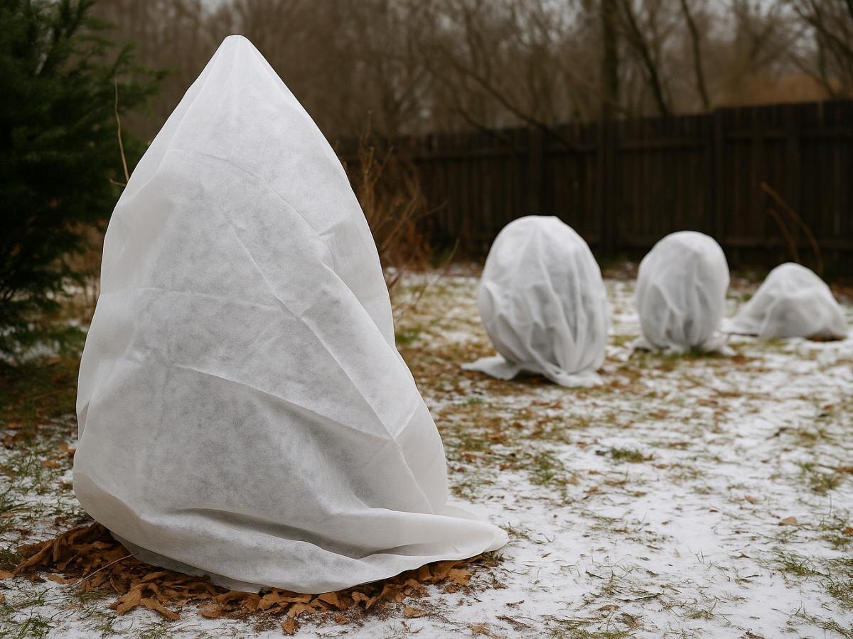 Существует множество вариантов для защиты растений от зимних воздействий. Наиболее популярным среди садоводов является спанбонд — укрывной материал, который изготавливается из полипропилена или полиэстера. Этот легкий и гибкий тканый материал обеспечивает отличный воздухообмен и помогает создать комфортный микроклимат вокруг растений, не препятствуя естественным процессам.