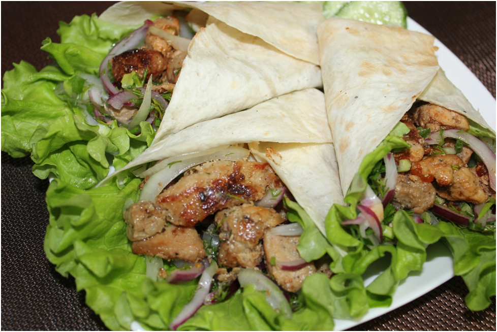 Готовое мясо подают в лаваше с маринованным луком и острым соусом. Получается замечательное сочетание! Возможен как прямоугольный, так и круглый лаваш, что добавляет удобства при подаче.
