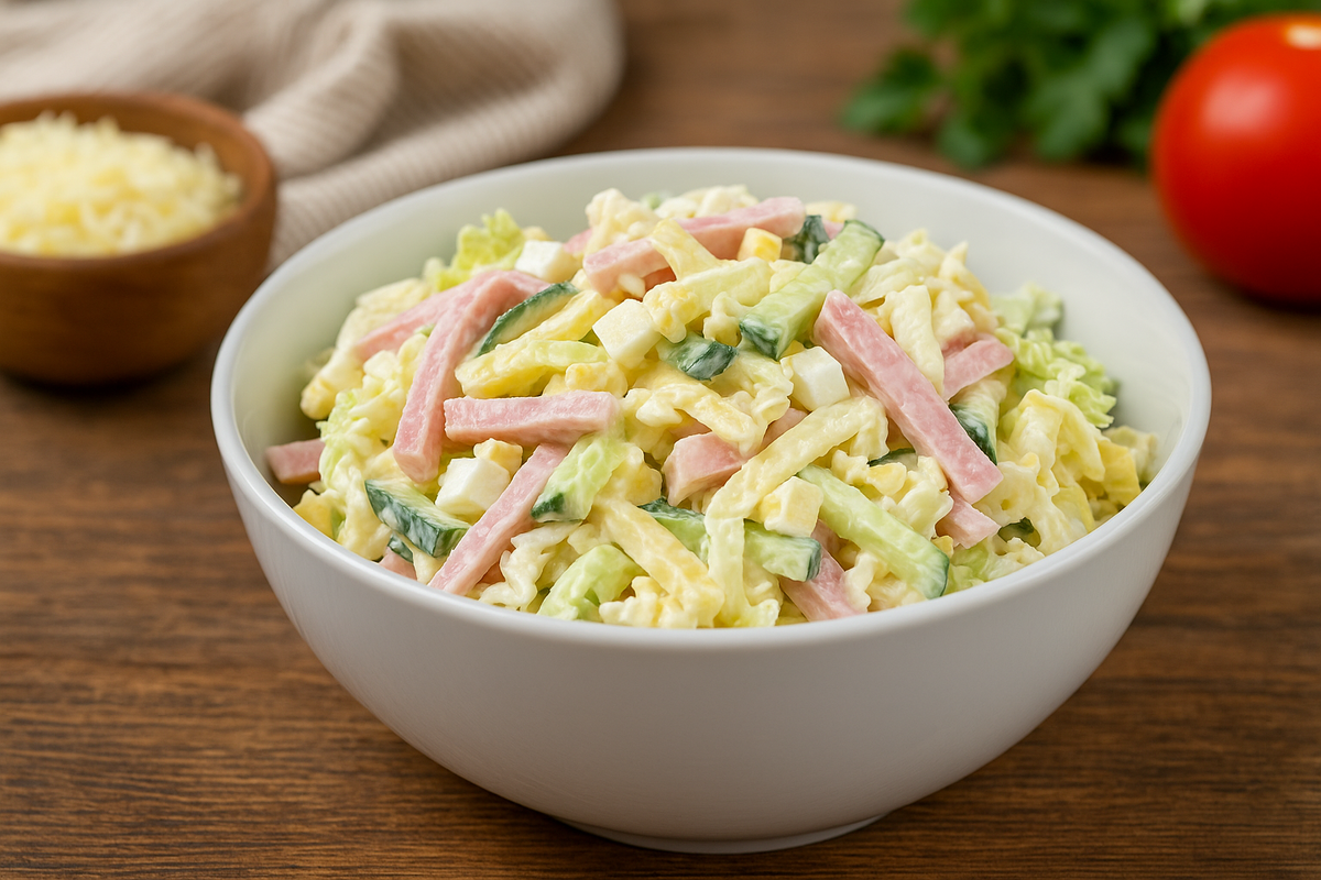 Салат Неженка полностью оправдывает своё название. Он обладает нежной текстурой и удивительным гармоничным вкусом, что делает его идеальным выбором для обеда, ужина или даже праздничного стола. Хрустящая пекинская капуста, свежий огурец, пикантный чеснок, ветчина и мягкий сыр под легкой майонезной заправкой — сочетание простых ингредиентов, которое можно повторять снова и снова.