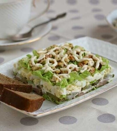 Этот изысканный салат станет прекрасным украшением любого праздничного стола и удивит ваших гостей своим великолепным вкусом и текстурой!