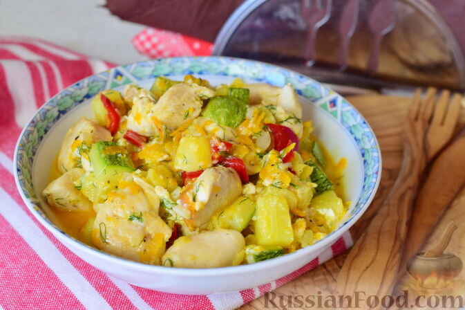 Куриное филе, тушеное в сметане с кабачком и болгарским перцем, наполняет блюдо сливочным вкусом, который буквально тает во рту, даруя незабываемые ощущения.