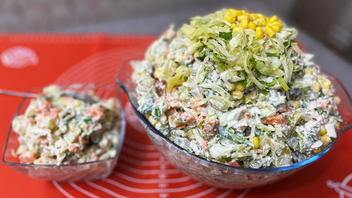 Начать стоит с варки овощей: картофель и морковь необходимо отварить до готовности, а куриную грудку поджарить или отварить. Пока они варятся, капусту следует нарезать тонкой соломкой и замариновать в уксусе, чтобы она стала мягкой и сочной. Огурцы нарезаются мелким кубиком, а куриное филе разбирается на волокна. Все ингредиенты, включая кукурузу, соединяются в одной миске, добавляются специи и заправка из сметаны и майонеза. После этого салат рекомендуется оставить в холодильнике хотя бы на час, чтобы он пропитался вкусами. Приятного аппетита!