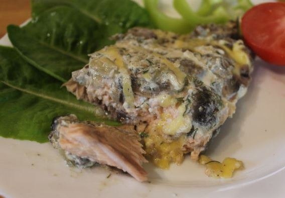 Сегодня на обед предлагается вкуснейшая горбуша, запеченная целиком в фольге с ароматным грибным соусом. В идеале, к ней отлично подойдет гарнир из отварного картофеля с кусочком сливочного масла.