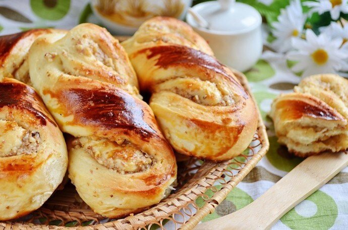 Когда тесто поднимется, слегка обомните его. На присыпанном мукой столе раскатайте тесто в прямоугольник. Равномерно распределите ореховую начинку, слегка вдавив в тесто. Сложите тесто: сначала одну треть на середину, затем накройте оставшейся частью. Нарежьте его на небольшие кусочки, закрутите и разместите на смазанном противне. Смажьте булочки желтком и дайте им постоять в тепле около 15–20 минут.