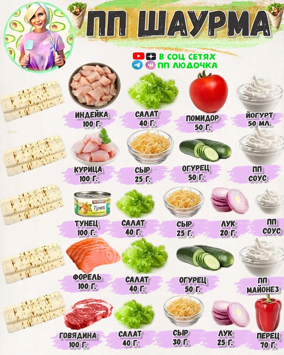 Краткое правило: Цельнозерновая лепешка + куриная грудка на гриле + огромное количество овощей + йогуртовый соус = ваша совершенная ПП шаурма.