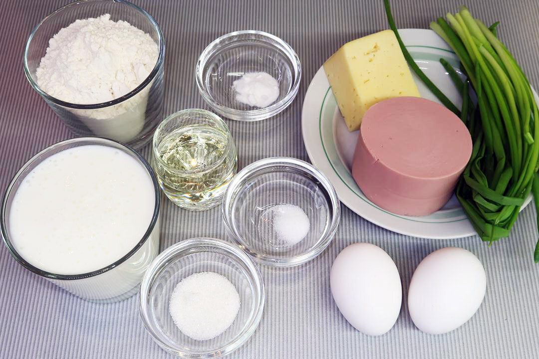 Добавьте просеянную муку и снова хорошо перемешайте. После этого оставьте тесто на 15 минут. В это время займёмся начинкой: сыр натереть на крупной тёрке, колбасу нарезать кубиками, а зелёный лук — мелко порезать. Все ингредиенты добавляются в тесто — колбасу, сыр и зелёный лук — и аккуратно перемешиваются.