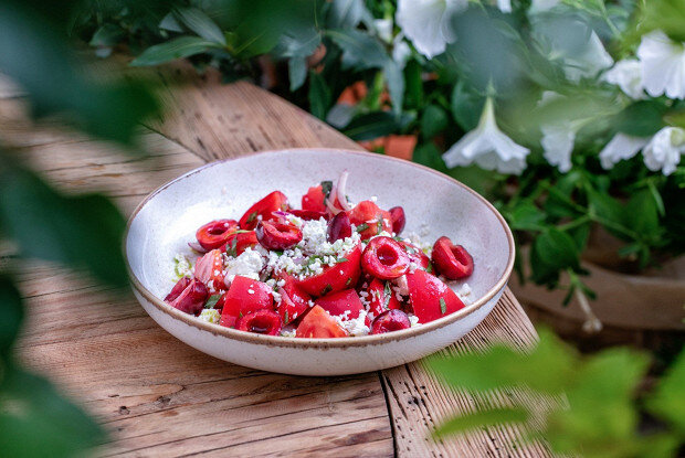 Этот яркий и свежий салат станет отличным блюдом для теплого летнего дня или для особого случая. В нем гармонично сочетаются сладость черешни и кислинка томатов, а нежный творог добавляет кремовой текстуры. Идеальное сочетание для тех, кто хочет удивить гостей!
