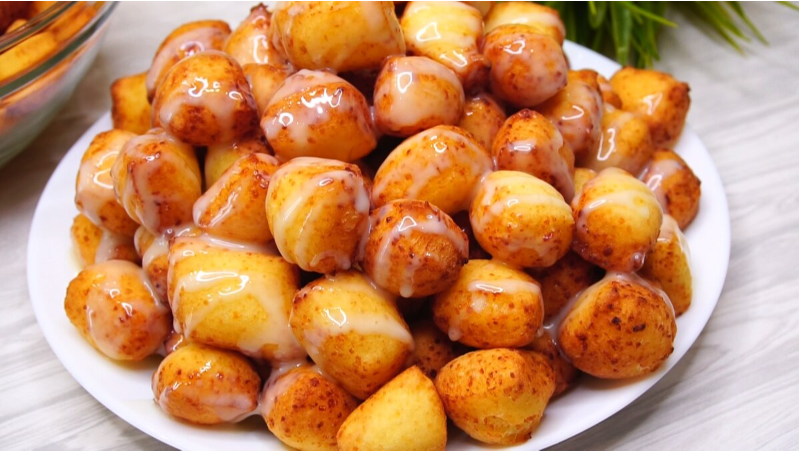 В сотейнике разогреть растительное масло и обжарить кубики на среднем огне до золотистого цвета. Выложить готовые шарики на бумажное полотенце, чтобы избавиться от излишков масла. Всего из небольшого набора продуктов получается большая порция вкусной выпечки. Полить готовые шарики сгущенным молоком, шоколадом или посыпать сахарной пудрой. Они великолепны как в горячем, так и в холодном виде.