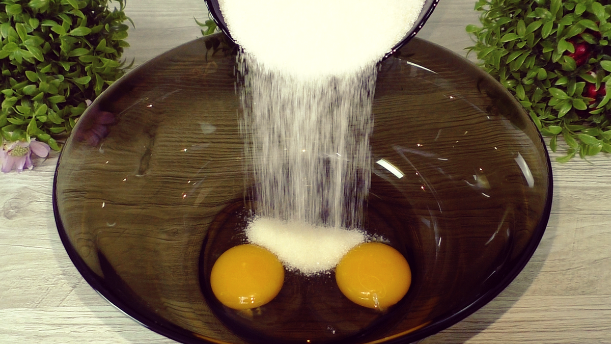 Начните с разбивания яиц в миску. Добавьте сахар и немного соли, затем взбейте венчиком до получения однородной массы, без использования миксера. Далее следует влить сметану и растительное масло, хорошо перемешав все ингредиенты.