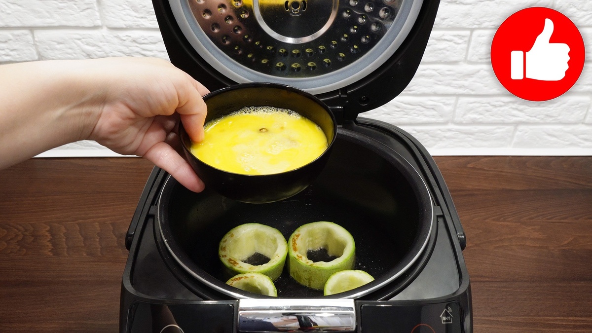 Далее в чашу мультиварки наливается подсолнечное масло и включается режим «Жарка». Когда масло нагреется, нужно обжарить кабачки с одной стороны в течение 2 минут. После этого их нужно перевернуть и залить яичной смесью.