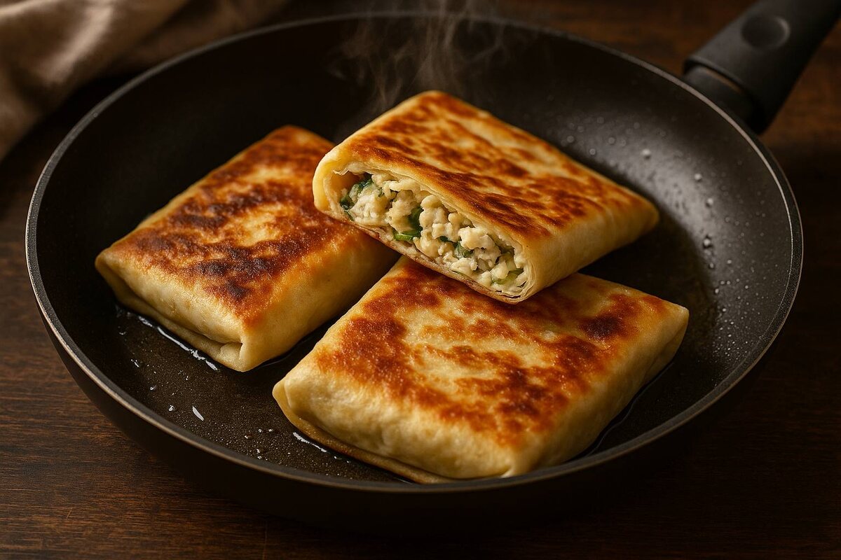 Смешайте нежный творог с зеленью и щепоткой соли, добавьте ложку сметаны. Любители сладкого могут заменить зелень на изюм и мед. Главное — сохранить начинку тонкой, чтобы рулетик равномерно обжарился и получил золотистую корочку.
