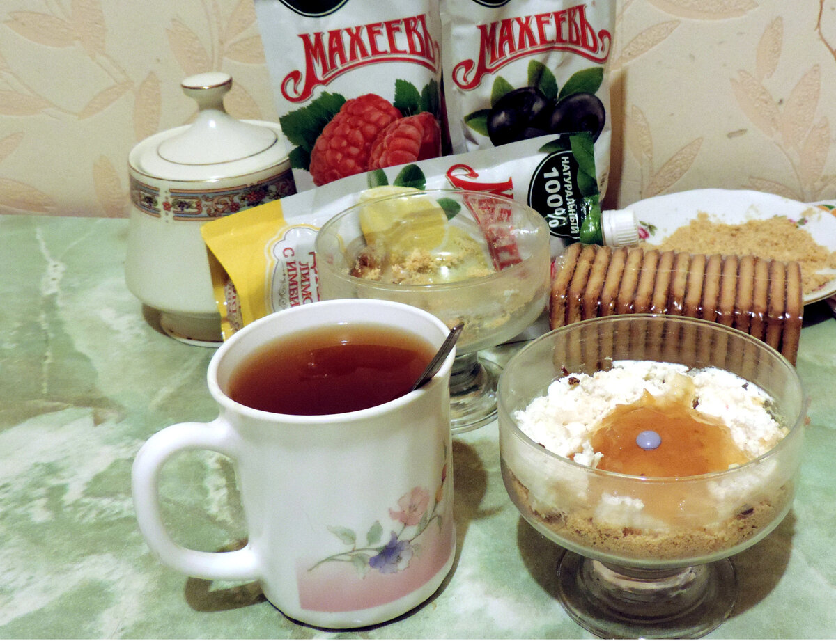 Далее подготовьте творожную начинку. Соедините творог с сахаром (по желанию, если хотите сделать десерт слаще), и выложите поверх печенья. Выбор джема — это отдельная задачка. Внучке пришелся по вкусу черничный, дедушка предпочел малиновый, а кто-то может выбрать лимон с имбирём. Каждый найдет свой идеальный вариант!