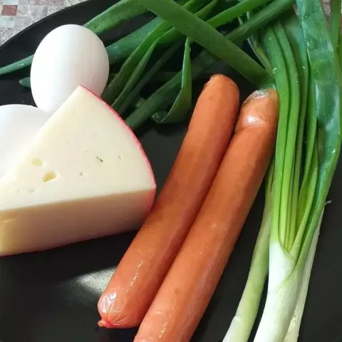 Начинку следует подготовить заранее: натереть сыр, нарезать сосиски и мелко порезать зеленый лук. Затем все ингредиенты добавляются в тесто и тщательно перемешиваются. На хорошо разогретую сковороду с растительным маслом выкладывайте тесто порциями. Обжаривать следует с обеих сторон до золотистой корочки. После жарки пирожки лучше всего выложить на бумажное полотенце, чтобы убрать лишний жир.