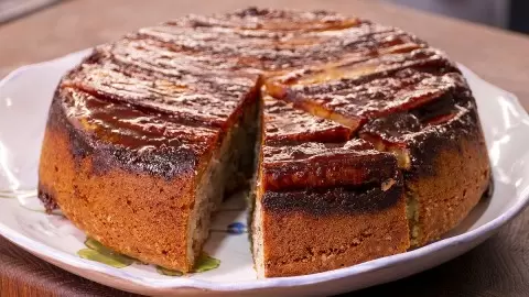 Форму ставят в заранее разогретую до 180 градусов духовку и запекают в течение 45 минут на режиме конвекции. Чтобы пирог не подгорал сверху, его можно накрыть пергаментом. После выпекания пирог следует аккуратно перевернуть на тарелку, предварительно придавить её, чтобы вышел лишний воздух. Убирая пергамент, можно сервировать пирог и наслаждаться с любимыми.