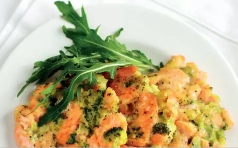 Сначала разделите брокколи на соцветия и отварите в течение 2-3 минут. После этого обдайте холодной водой и мелко нарежьте. Лосось нарежьте кубиками размером около 1 см, но можно также использовать рыбный фарш. Объедините лосось, брокколи, яйцо и посолите. Затем добавьте муку и тщательно перемешайте.