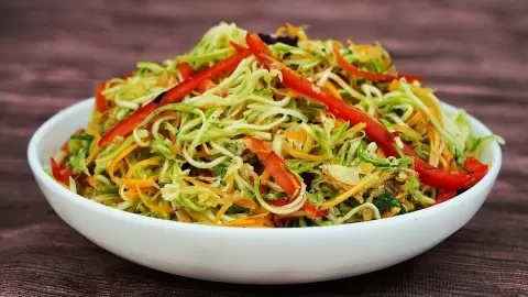 Процесс готовки прост и не требует много времени. Начать следует с подготовки овощей. Кабачки и морковь натереть на терке, используемой для корейской моркови. Затем болгарский перец нарезать не мелкими кубиками, а соломкой – это придаст салату особую текстуру.