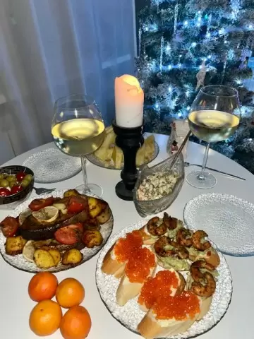Пара отметила Новый год дома: планы на рейв были отменены после операции на ноге у Стёпы за неделю до праздника, поэтому праздник прошёл в уютной камерной обстановке. На столе — минималистичный, но продуманный набор блюд, без излишней «майонезной» нагрузки.
