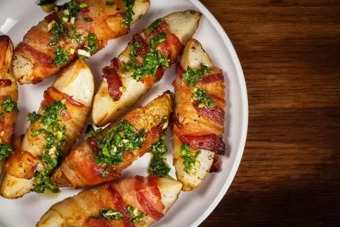 Эта простая и аппетитная закуска порадует как взрослых, так и детей. Сочетание картофеля с беконом и сыром создает невероятно насыщенный вкус, а приготовление не займет много времени.