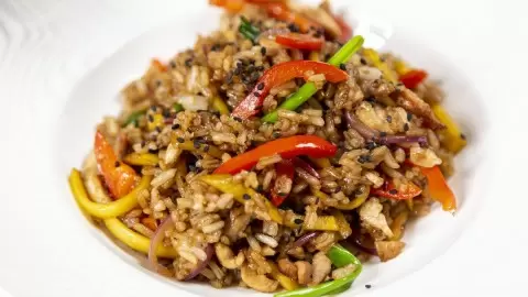Разогрейте сковороду с растительным маслом и обжарьте куриные кубики до золотистой корочки. Затем добавьте лук, болгарский перец и имбирь, обжарьте ингредиенты еще минуту. После этого добавьте нарезанное манго, зеленый лук, отварной рис и немного соевого соуса. Все хорошо перемешайте и готовьте еще полторы минуты, после чего снимите с огня.