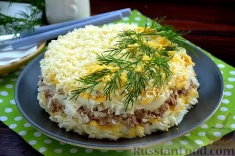 Не забудьте добавить в меню и классический салат "Мимоза", состоящий из рыбных консервов, яиц, сыра и сливочного масла. Эта безусловная классика всегда уместна на праздники!