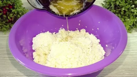 1. В глубокой миске смешать творог, растопленное сливочное масло и щепотку соли. Добавить ванилин или ванильный сахар по желанию.