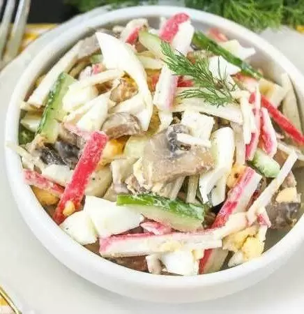 4. Грибы после обжарки должны остыть, затем их добавляют в общую емкость с нарезанными палочками и огурцом.