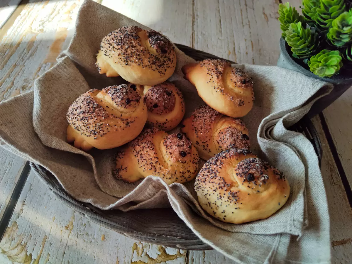 Следующий шаг – формовка булочек. Рабочую поверхность следует смазать растительным маслом, затем поделить тесто на 12 кусочков. Сформированные шарики накрывают пленкой на 15 минут. Для придания булочкам еще большей привлекательности, их обваляют в сахарно-маковой смеси. Каждую порцию теста раскатывают в жгуты и завязывают узелком. На верхнем конце формируется голова с клювиком, а нижний срезается для создания хвоста. После формирования, булочки лучше еще раз оставить на расстойку примерно на 15 минут.