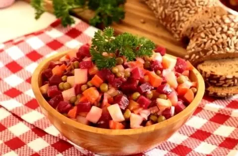 - Ингредиенты: для классической версии потребуются 3 свёклы, 2 моркови, 3 картофелины, 2-3 солёных огурца, 6 ст. л. консервированного горошка и одна луковица.